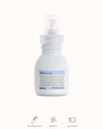 - En conditionneur sans rinçage: après avoir lavé ses cheveux avec le shampoing-gel douche SU Hair & Body Wash après-soleil, vaporisez notre spray capillaire SU Milk sur toute la chevelure. Peignez ensuite les cheveux afin de répartir le soin capillaire des racines jusqu'aux pointes. Ne pas rincer.